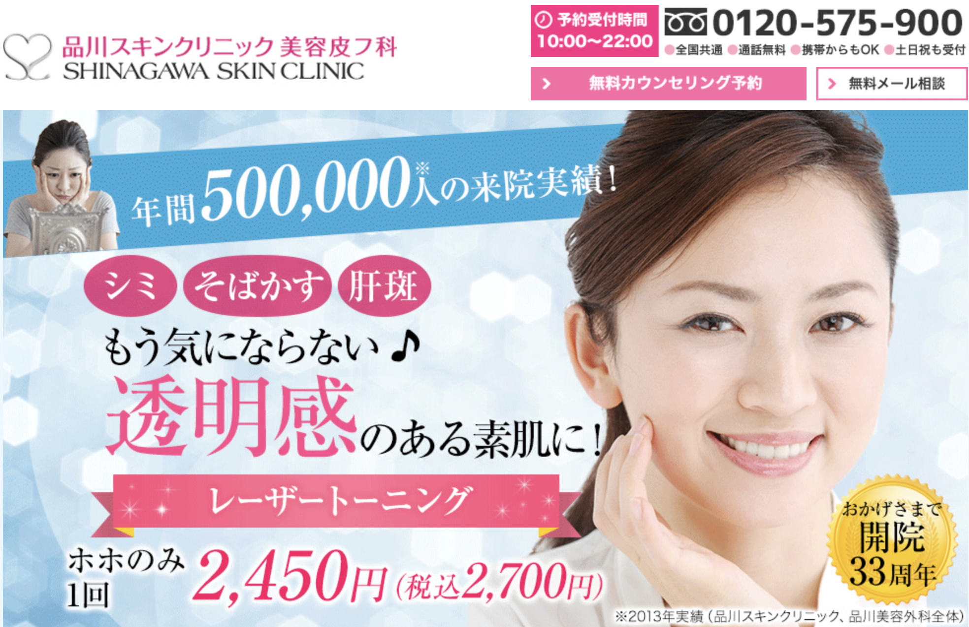 品川スキンクリニックは品川美容外科と提携しているクリニックで、両方合わせると全国に37院展開している大手クリニックです。そのため品川美容外科でも行っているシミ取りのメニューが受けられます。駅からも近く通いやすいクリニックですよ!