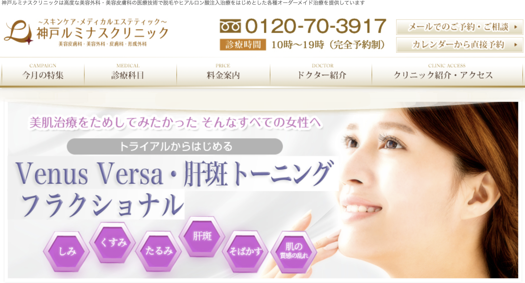 神戸ルミナスクリニックは今月のおすすめとして美肌ケアがあります。シミ取りに特化したヴィーナスヴェルサ医療機器付きのコースが26,400円で受けられるチャンスです。こちらのクリニックは毎月おすすめメニューが変わるので、こまめにチェックしてください♪