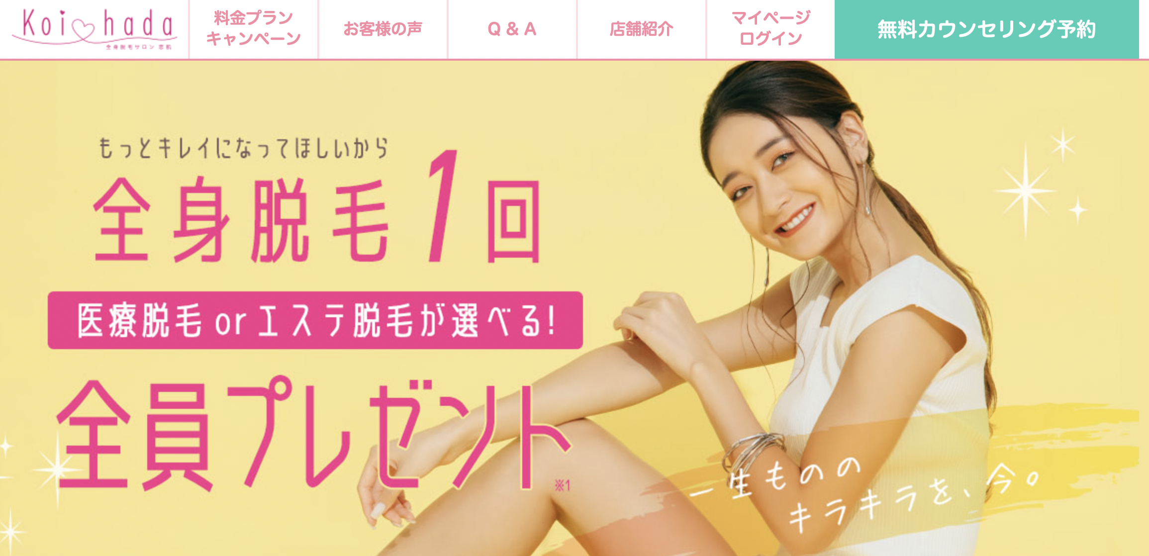 恋肌は業界最大級レベルの、全身62部位照射可能なサロン脱毛です。「全身脱毛デビューパック」は、全身62部位を2回脱毛するメニューで、最短2週間に1回のペースで受けられます。さらに12ヶ月分の料金が無料になるお得な安いプランです♪