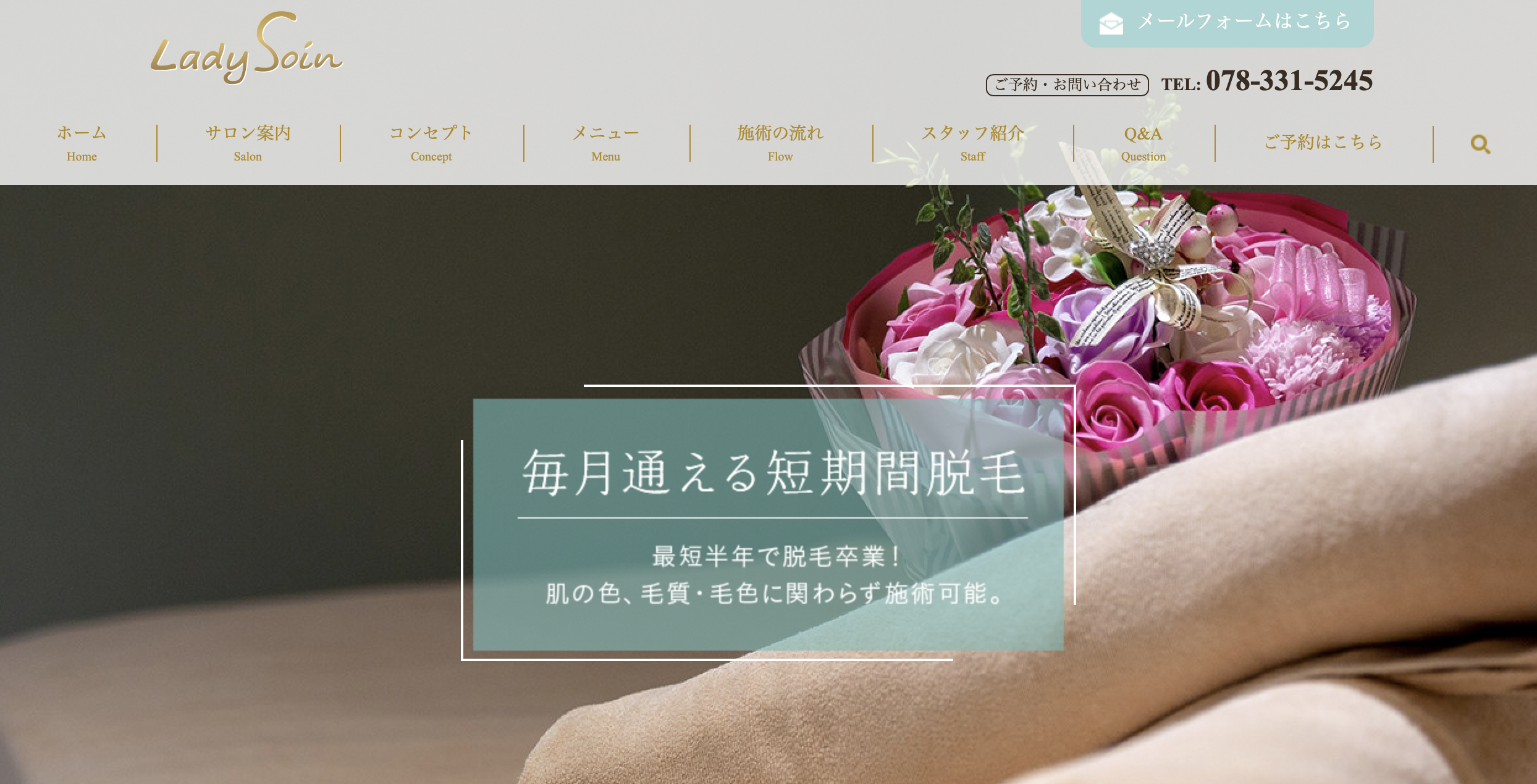 LadySoin(レディーソワン)は、完全予約制のプライベートサロン脱毛です。癒しの個室があり、リラックスできるように配慮してくれます。無料カウンセリングでは脱毛に関して、不安や心配な事を気軽に相談できますよ。