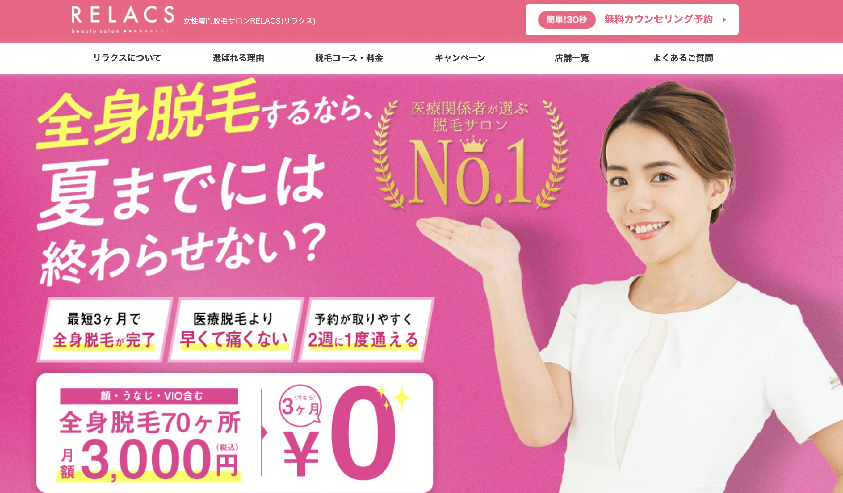 RELACS(リラクス)神戸店はたくさんの脱毛メニューと、通いやすい価格がおすすめのサロン脱毛です。業界最安値水準で、患者一人ひとりに合わせたメニューを提案してくれます。また初めて来院する人は、次回使える10,000円分のクーポンがもらえますよ♪