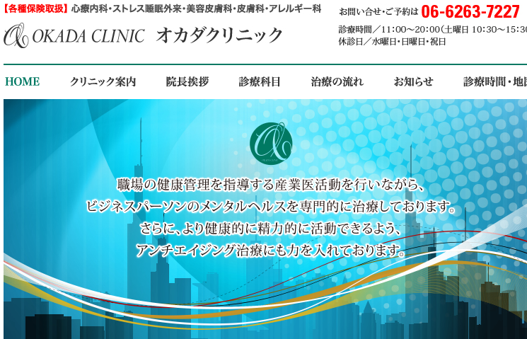 オカダクリニックは、心療内科、睡眠外来、皮膚科、アンチエイジングを中心に診療しているクリニックです。ニキビの原因が睡眠やストレスだったという場合もあり、より複合的に原因を解明してくれるクリニックです。