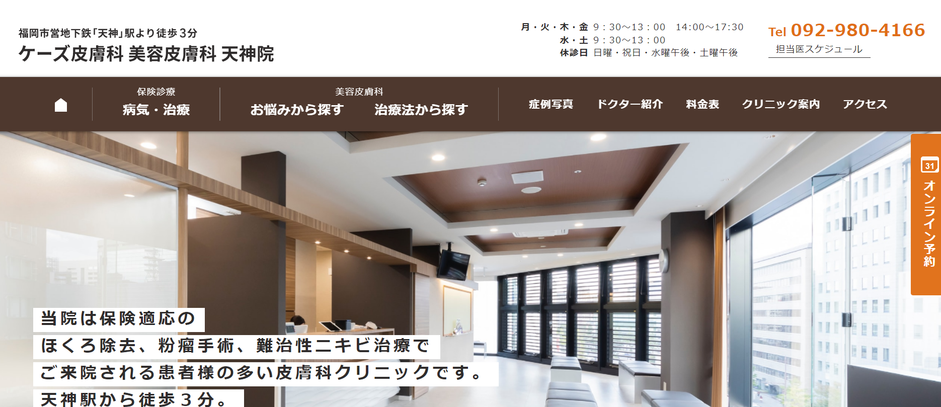 ケーズ皮膚科美容皮膚科天神駅から徒歩3分とアクセス抜群。買い物帰りや仕事帰りなど、ついでに来院することも可能です。天神駅をよく使うという方はぜひ調べてみてくださいね。