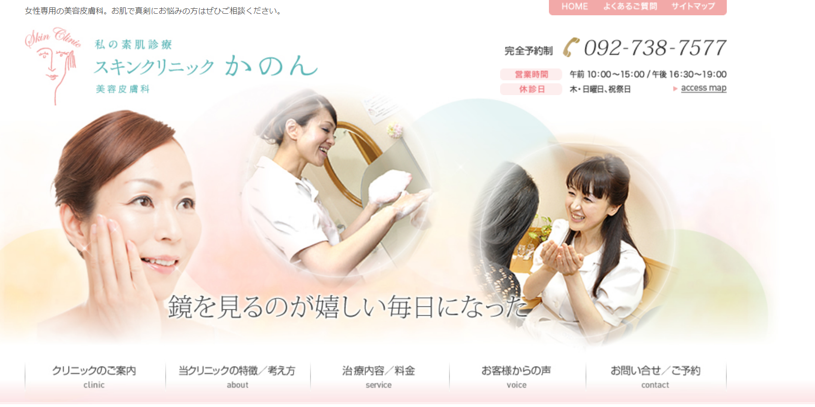 スキンクリニックかのんは、「嬉しくなる素肌」をつくる女性専用の美容皮膚科クリニックです。日頃のちょっとしたお肌悩みから、シミやしわ・ニキビ跡などしっかりと対処が必要な症状なども同じ女性だからこその目線とノウハウでしっかりと診察してくれます。
